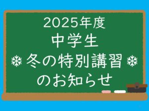 中学生対象の冬期講習のご案内です。 ★日程★ 【12月】 25日(木)18:30~21:30 26日(金)18:30~21:30 27日(土)13:00~16:00、16:00~19:00 28日(日)9:00~12:0 […]