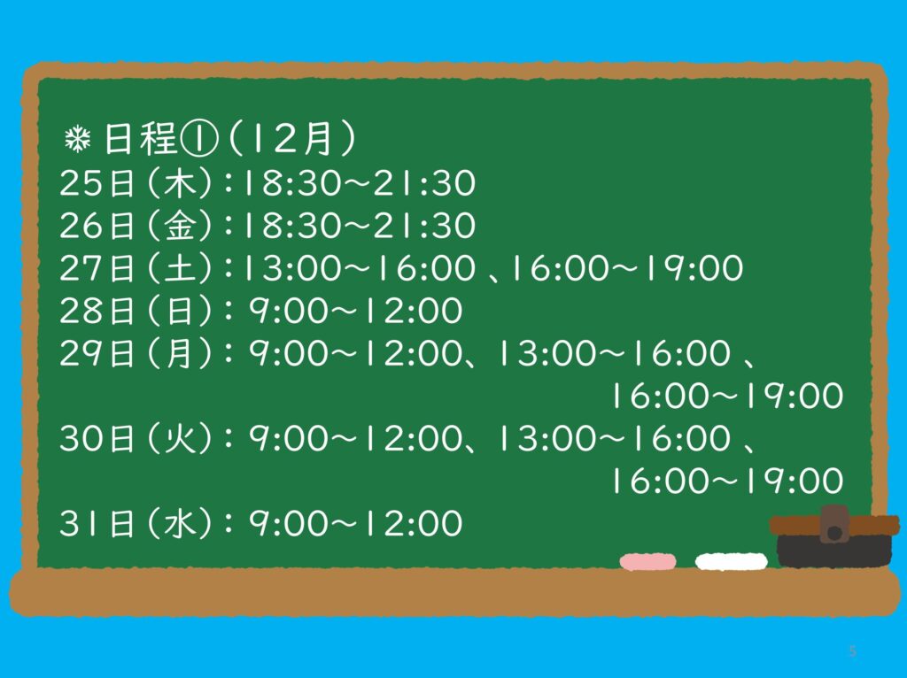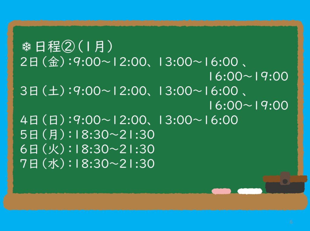29日(月)9:00~12:00、13:00~16:00、16:00~19:00